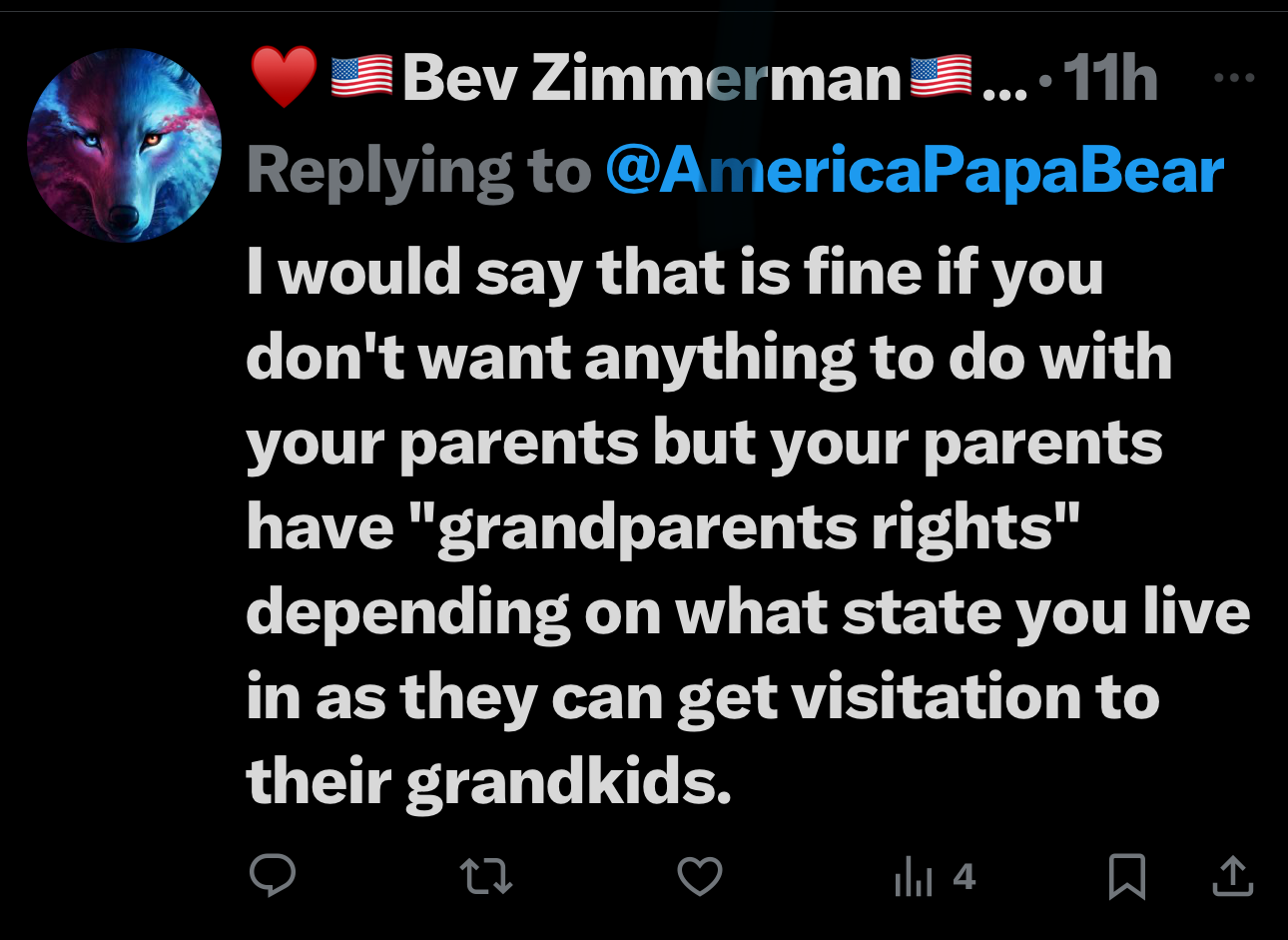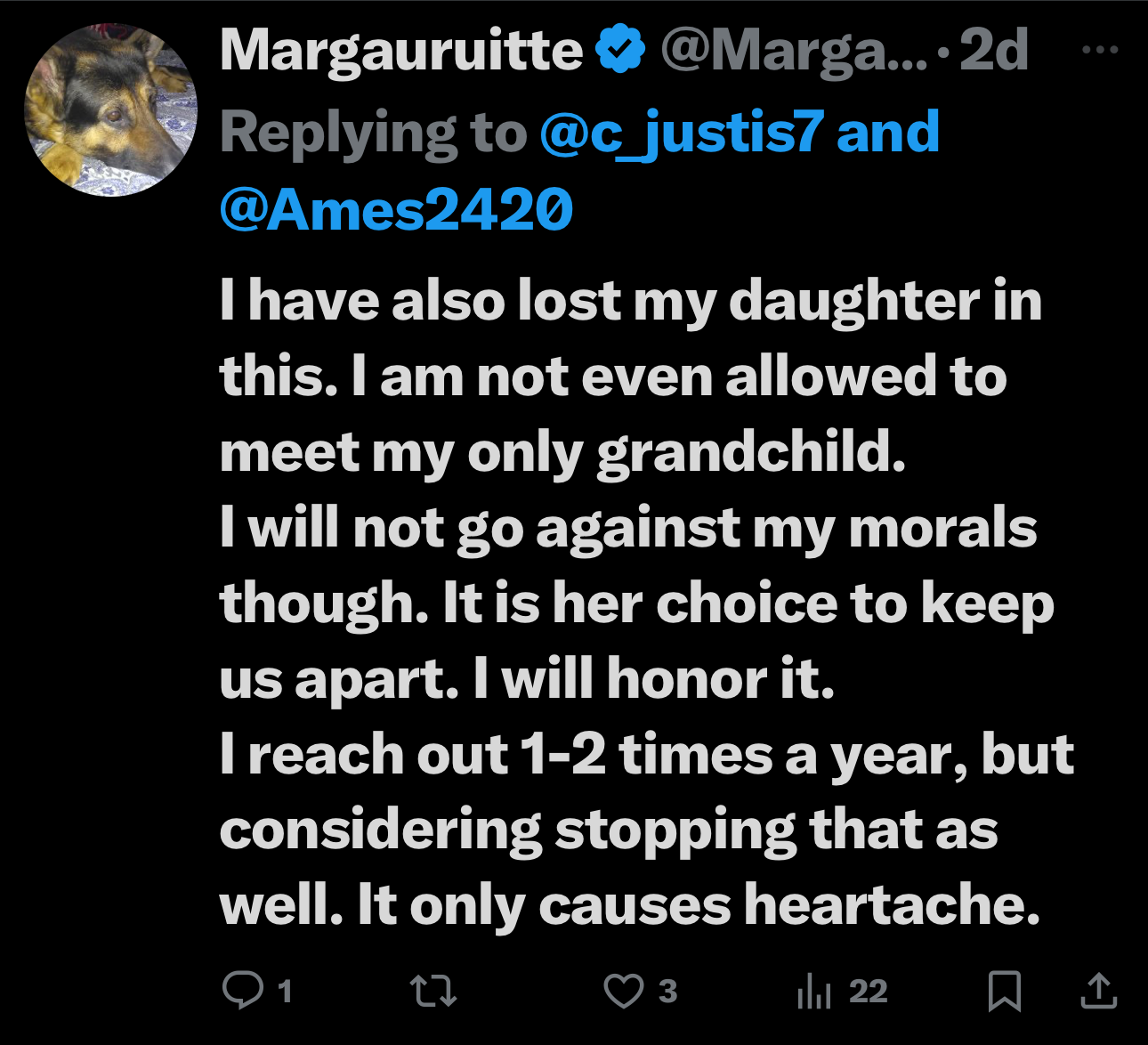 I have laid this at God’s feet. That is how I get through some dark days. I had put all my time and energy into being a very involved mom to my sons. I would have been a positive influence and rained down my god given love on my grandchildren. I still hold out hope that the future will bring me that opportunity. I do still send gifts to my grandson, to somehow stay connected. They did allow us an afternoon visit this last summer. We are strangers to our sweet grand baby.