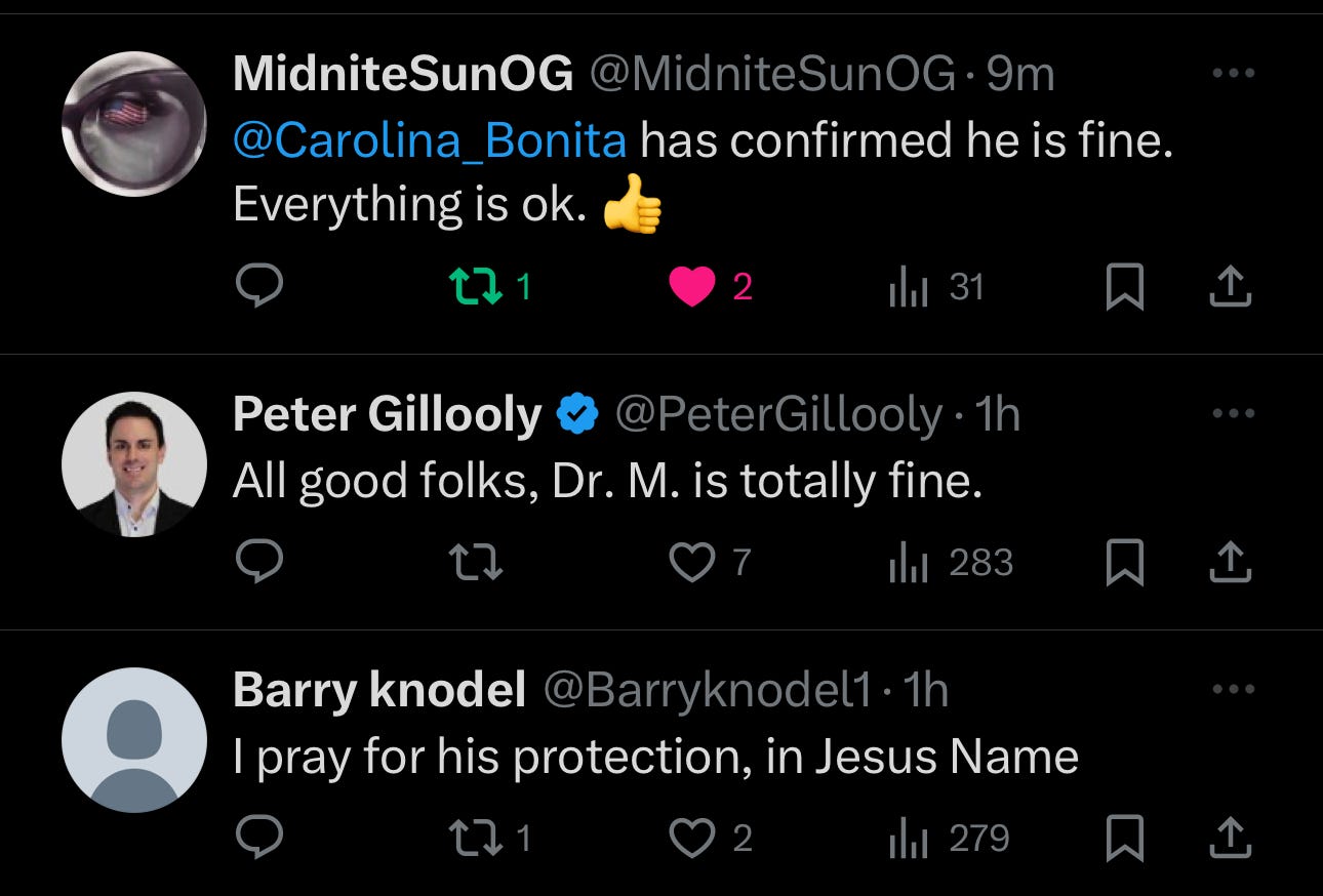 Carolina immediately left our call, then called and spoke with Dr. McCullough’s family. She confirmed that Dr. McCullough is fine.