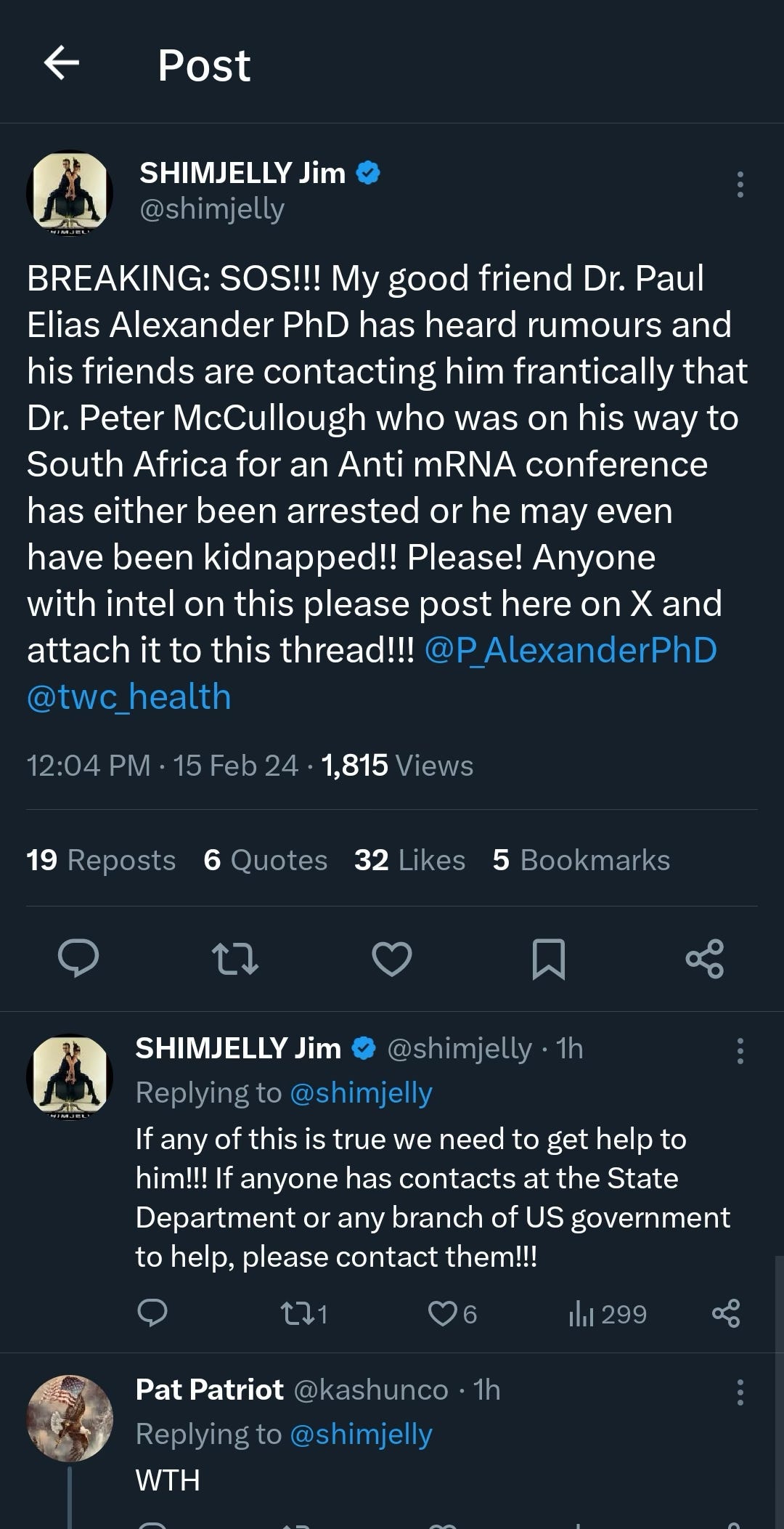 Just under 15-20 minutes ago, I was on a phone call with Carolina, who paused to take the caller who relayed that Dr. Peter McCullough was possibly kidnapped.