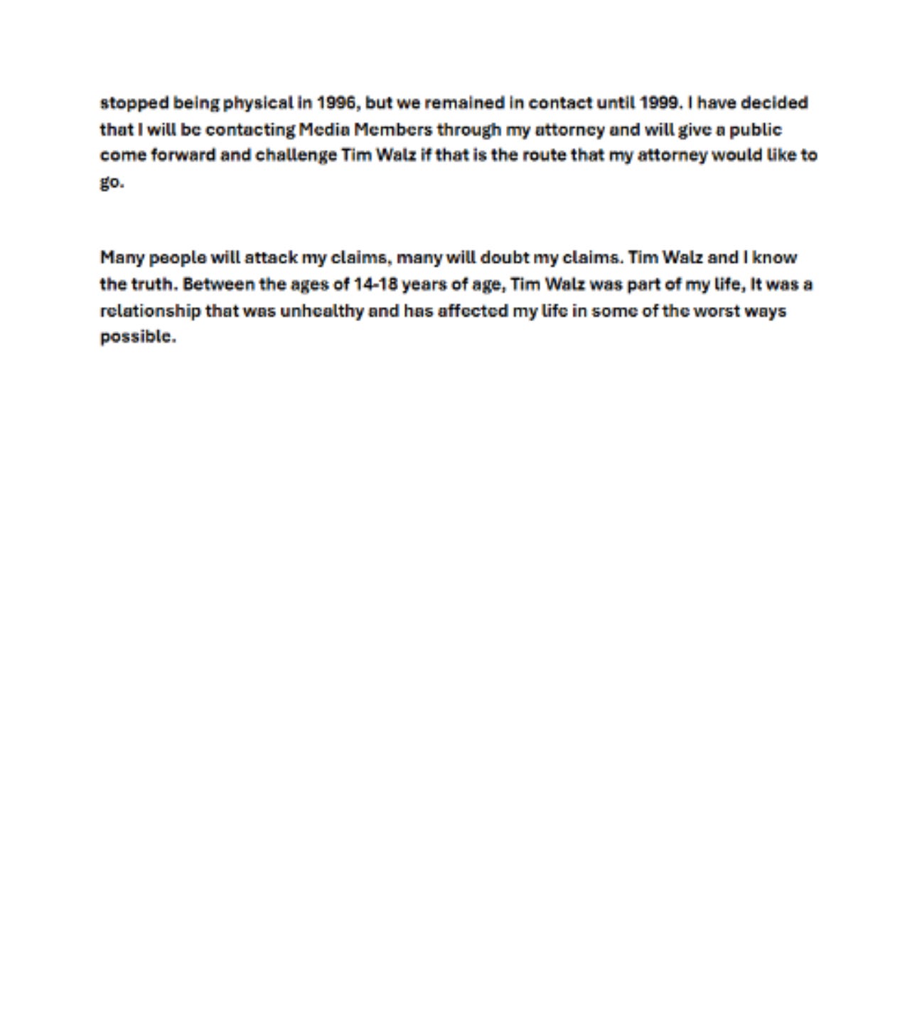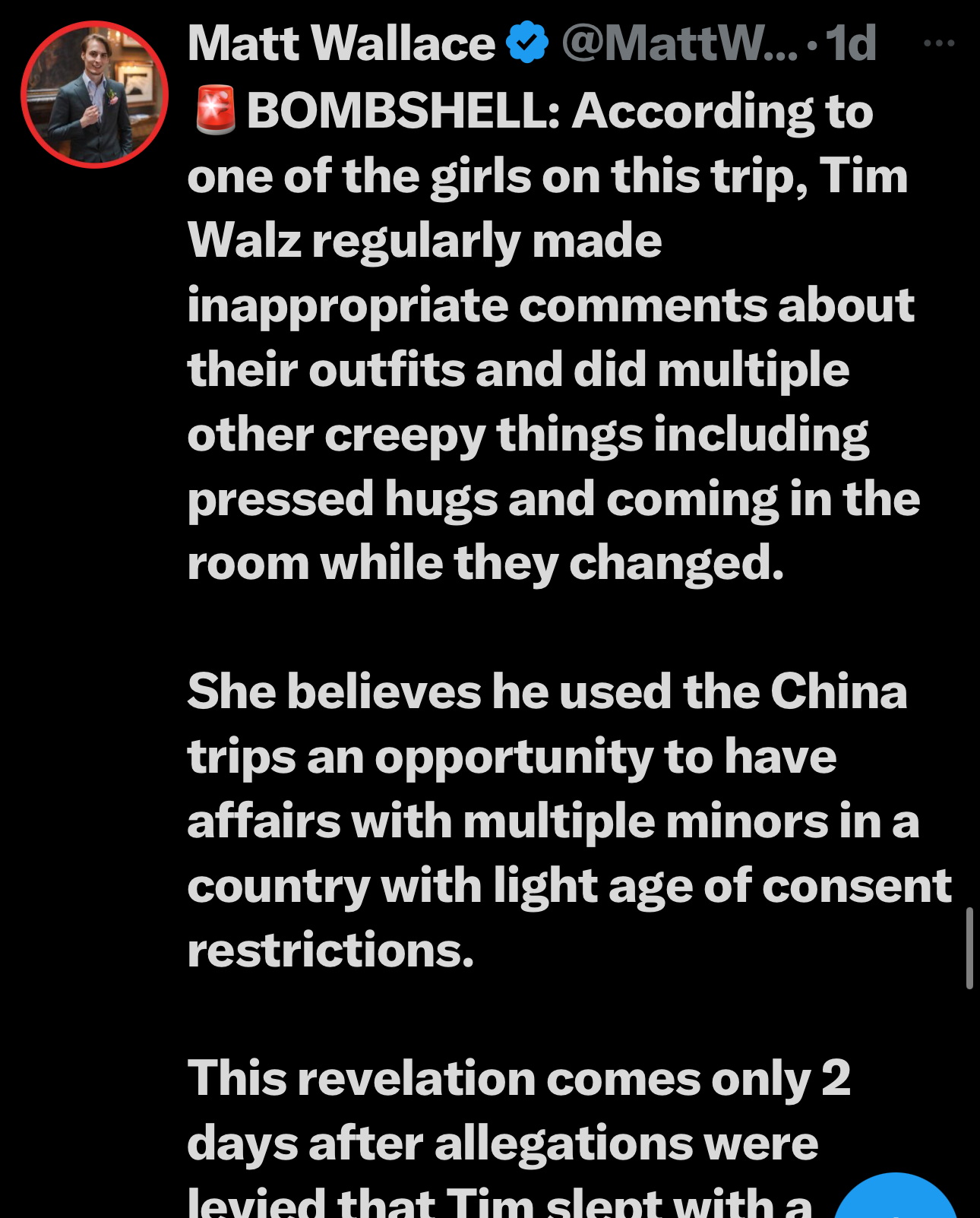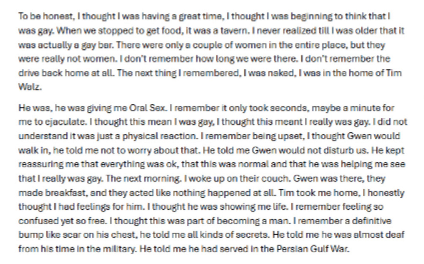Walz' personality and demeanor signal this likely aberrant behavior. This detailed personal disclosure confirms the suspicions of many. I look forward to this courageous man coming forward with a public accusation and lawsuit asap.
