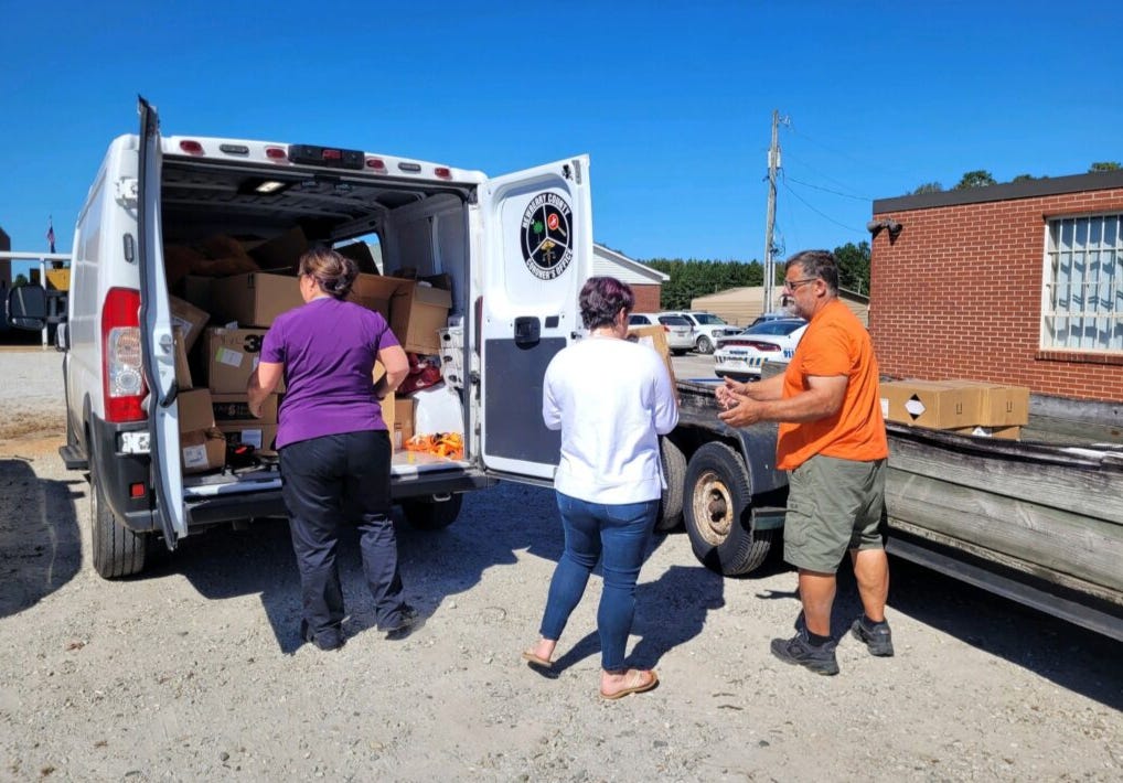 At the time of Helene, Mindy lived in her home in Florida. Winds went up to 185 mph. While her Mom died a while back, Mindy inherited her home but had not lived in it until she was without power for five days in Florida. She came up to the area to help, and the rest is history.