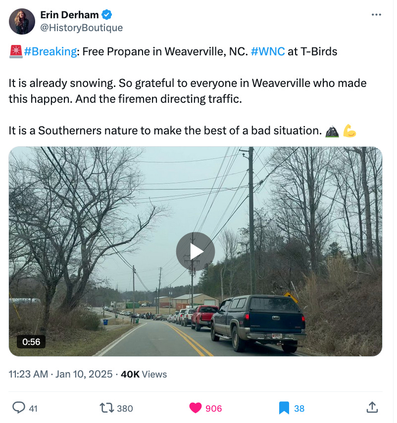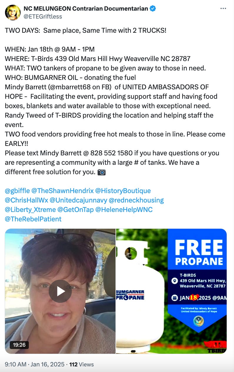 Mindy told me that 100% of donations go to provide heat, food, and assistance to Hurricane Helene Survivors. Sometimes they purchase electric heaters; other times, heating blankets. Whatever is needed to help keep people WARM, that’s what Mindy does! AND she doesn’t even ask for driver’s licenses to have people prove they live there; she leaves it up to God. Mindy’s next goal is to provide propane to outlying cities, and obtain the fuel from different companies so that one company isn’t holding the whole effort.