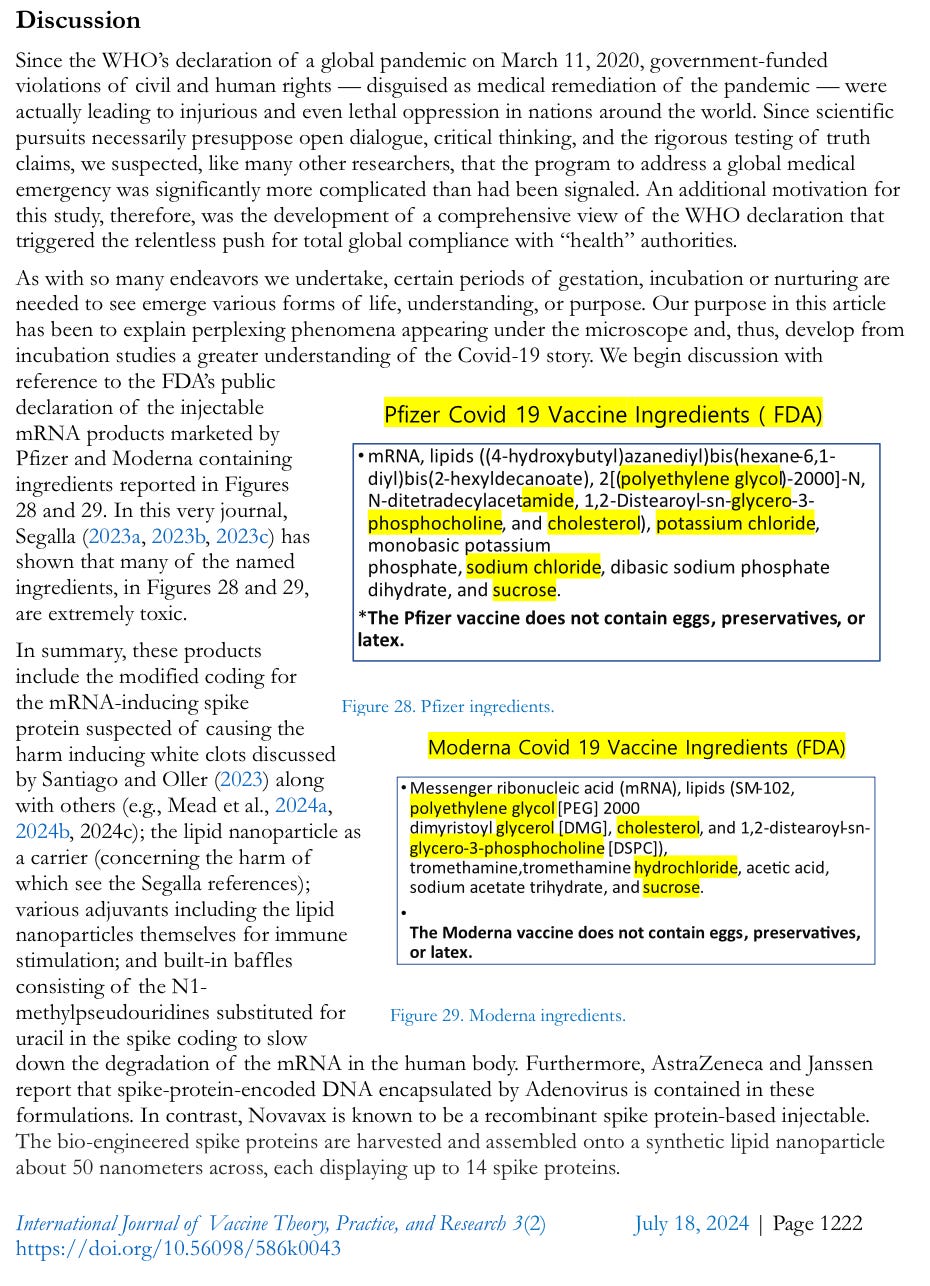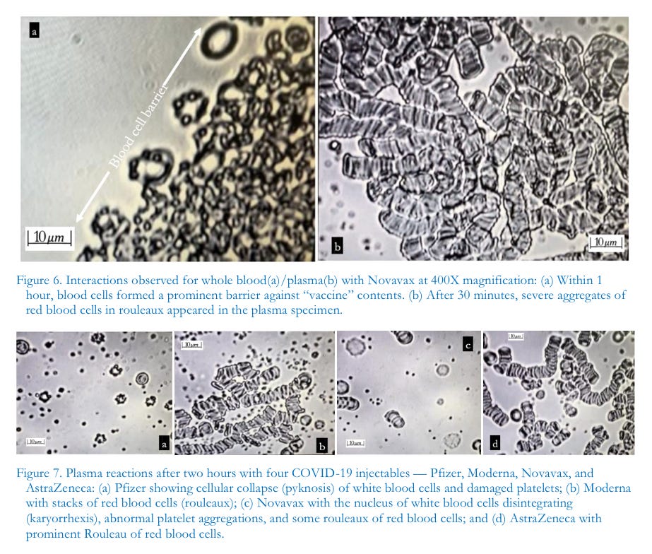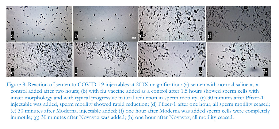 In our study of reactions to the foregoing four kinds of COVID-19 injectables by whole blood, plasma, and sperm, Novavax showed the most rapid cytotoxic effects. However, Pfizer and Moderna mRNA products showed more progressively injurious and ultimately lethal effects on living blood and sperm cells. They, furthermore, resulted in unprecedented self-assembling geometric chip-like structures, ribbons, filamentous structures, and encapsulated structures within structures. Whereas we suppose that the announced ingredients and components of Figures 28 and 29 actually are present in the heavily marketed government-backed products, closer examinations and our own experimental studies show that there must also be unannounced nanomaterials that are invisible to standard microscopic examination. Also, despite reports offered for public review outlining ingredients, several additional studies would rule out the presence of ordinary DNA or RNA based on the absence of phosphorous and nitrogen which are abundant in those macromolecules (Hagimă, 2023a). Experts in genomics recently discovered that the cancer-promoting SV40 gene is present in the COVID-19 Pfizer and Moderna injectables (Murakami, 2023; McKernan et al., 2023). The connection to cancer has been well established (Shah, 2006). If the spike protein is produced by the injected programmed mRNA, as hypothesized, the result could trigger a variety of toxic effects to multiple organs including vessels which could, finally, induce multiple organ failures —endothelial inflammation, immune imprinting, and the cytokine storm (Blaylock, 2021, 2022a, 2022b). The injection contents could damage the intracellular mitochondria and p53 genes, sabotage the body’s ability to repair damaged DNA, induce immune system depletion, trigger frequent gene mutations and cancers, various autoimmune diseases, as well as reproductive failures (Alavi & Kheradvar, 2012; Xie et al., 2021; Idrees & Kumar, 2021; Classen, 2021; Seneff et al., 2022; Gat et al., 2022; Mead et al., 2024a, 2024b, 2024c). Through biochemical analysis of the injectablebculture media, the most significant finding was the presence of protein. If the media are alkaline, or if they contain chlorhexidine (0.25%), the media could reveal a false-positive. However, most culture media were maintained as acidic throughout the entire incubation period, which left no possibility for chlorhexidine to be introduced to the experiment. If there were no exposures to chlorhexidine as our study has ensured, how and from where could protein have emerged?During the initial incubatio period, the presence of protein was not detected. Without any bacterial contamination, protein could only be produced by the injectable itself in the distilled water or normal saline media. According to Cell-Free Protein Synthesis, described by Endo (2021), the bubblesbobserved in our study could be the result of self-synthesized proteins, which could be toxic. Most interesting was the initially undetected, then detectable (day 23~day 82), and ultimately once again undetectable progression of protein synthesis. We discovered what initially appeared to be a coincidental relationship between (a) the developmental patterns of self-assembled nanostructures (peak stage of development, 2 to 6 months), (b) the behavior of hydrogel (initially transparent for 2 to 3 weeks, later gel-like emulsion in nature until day 150, and finally returning to its transparent consistency) and (c) protein production to some degree. Further studies are needed to clarify the central issues regarding all three of these apparent dynamic relationships. Turning to Burkhardt’s analysis (2022), we remind readers of the effects of the spike protein and the synthesis of many kinds of proteinaceous materials discovered in blood clots (approximately 323 kinds of proteins) —especially 4 kinds from endothelial tissue damage.