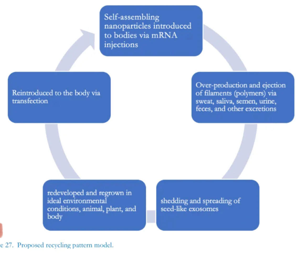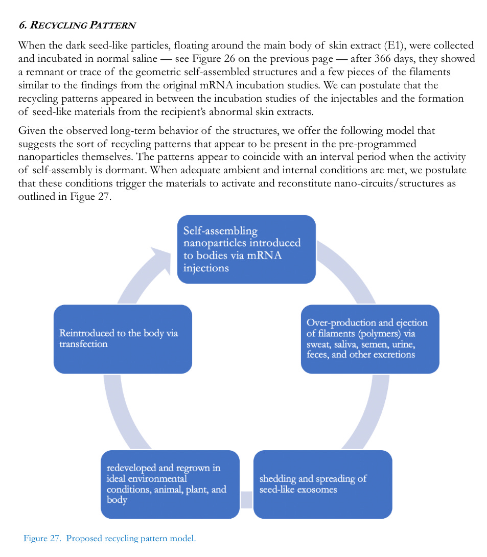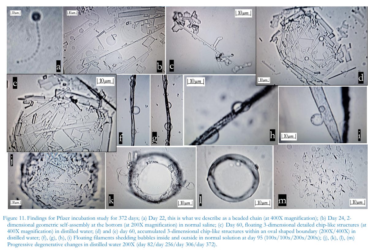 Despite rampant speculation in the literature regarding the use of COVID-19 injectable products and the development of wireless body area networks, abbreviated to WBAN (Jornet & Akyildiz, 2013; Jing et al., 2023), more interdisciplinary work is needed. Such studies would aid in the development of possible electromagnetic treatment modalities for recipients seeking alternatives to either standard chelation protocols or escaping entirely from an electromagnetic energy-polluted environment. Incubation studies, furthermore, showed that distilled water served as an ideal medium to reveal unique changes in the growth of injectable contents. Since distilled water is unadulterated and undisturbed by its own electrochemical properties, we postulate that it has latent potential to manifest the specifically engineered developmental pathways, the intended characteristics of the injectable contents, and to respond, as programmed, in easily observed ways to electromagnetic energy. In the plasma reaction, we speculate that the self-assembly process of nanomaterials was hampered by the profusion of blood cells at the bottom of the dish where space for self-assembly was already occupied. However, very few small chips were found at the bottom of the plasma dish by one month incubation and then disappeared. Later, filaments and pipe-like structures, even relatively small and few, appeared and maintained their morphology until the late stage of incubation. This finding indicates that initial assembly at the bottom is not a prerequisite to the later development of the filamentous structures. So, in vivo, it could be possible to produce various nanofilaments or carbon nanotubes without any prerequisites whatsoever.