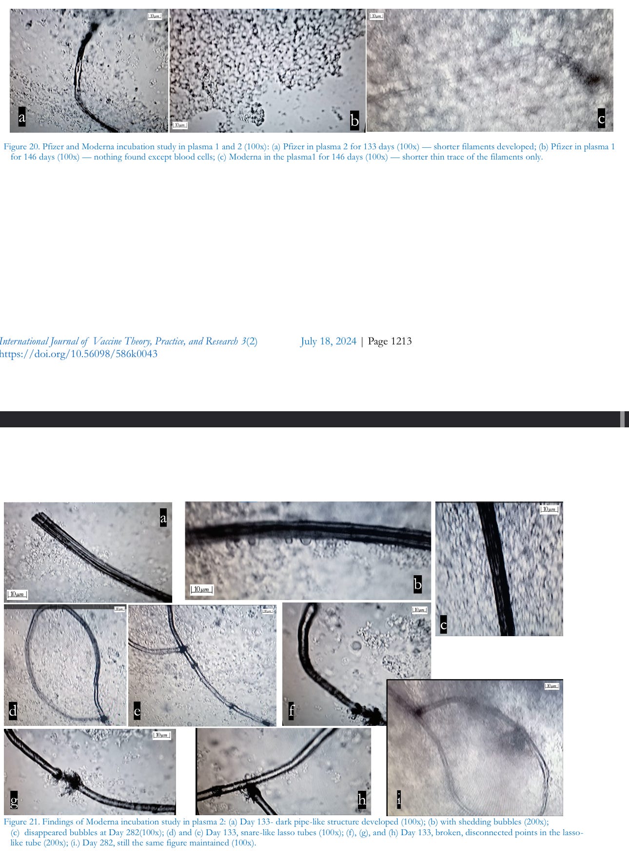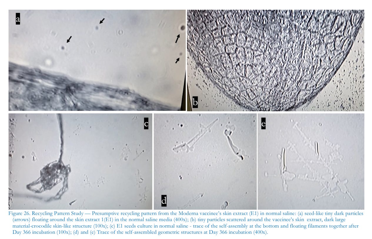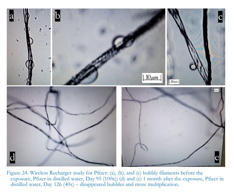 The entire process, we theorize, must be periodically re-enforced, likely through the prescribed regimen of new “booster shots” per CDC recommendations. Occasionally, other researchers have reported microscopic findings of filamentous structures in commercially branded normal saline. Despite apparent similarities in morphology with injectable filaments, the structures found in saline are slightly different in their behavior and growth patterns. Noteworthy were the various unusualstructures that appeared: unique striated curled ribbons and various filaments, scaled like snakeskin, that seemed to contain hollow compartments as in bamboo shedding bubbles. These structures proliferated throughout the medium and were elongated, twisted, knotted, discolored, and varied in texture.During our observational studies, the filaments that appeared to shed bubbles were consistently active. We urge that further studies are needed to differentiate whether these filaments derive from the basic media or from the injectable product itself. Regardless, isolating their origin could represent a significant discovery for the question of whether many, or even, most other pharmaceutical products and/or manufacturing processes are already contaminated by nanotechnology. It is sobering to think that the covert technology may not be limited to the COVID-19 injectables.