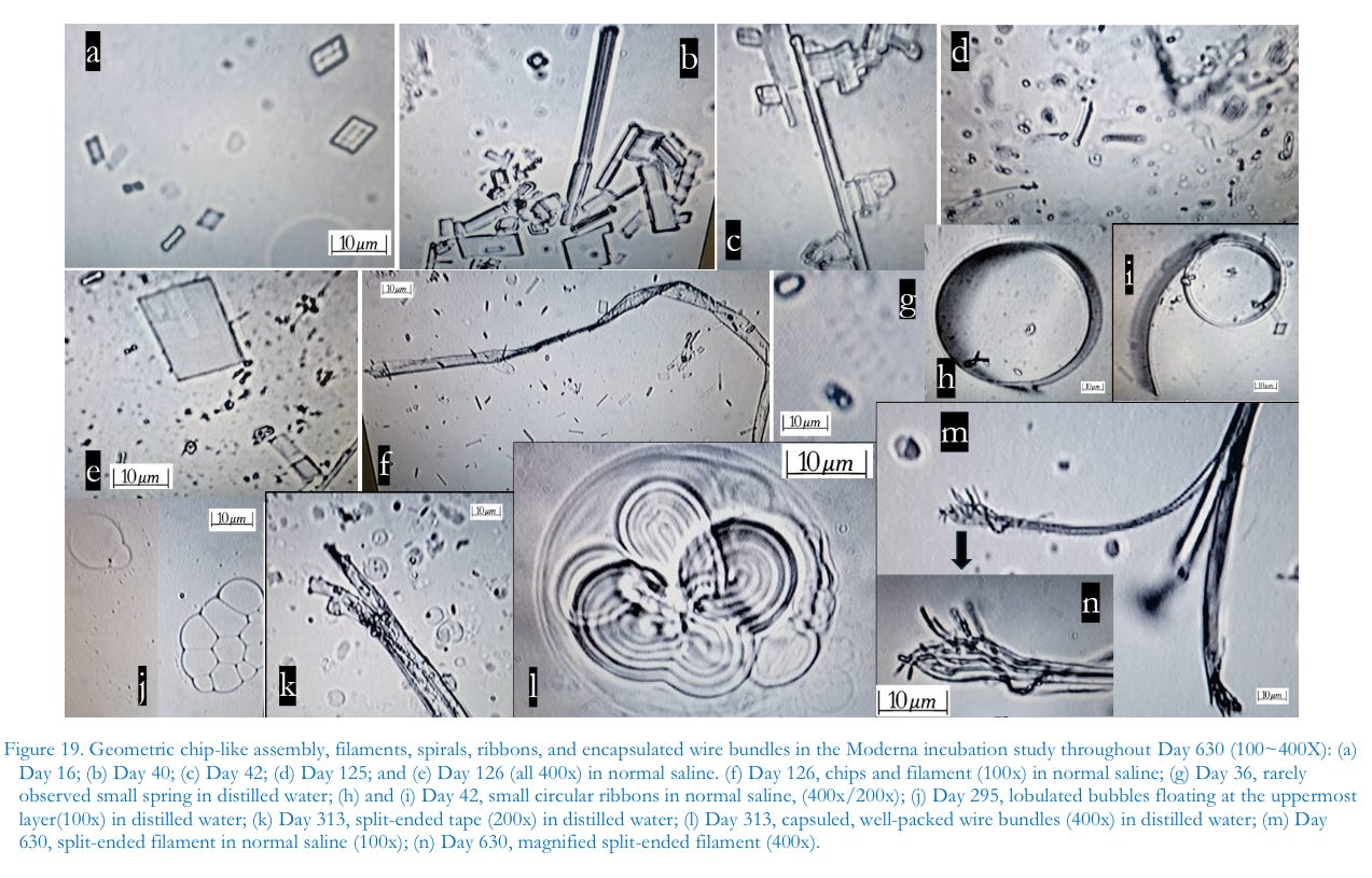 Beyond the above-mentioned sequalae of infections or injections, many kinds of medical evidence were reported about the toxic spike protein characteristics —loss of elastic fiber could induce rapid skin aging and vascular rupture. Moreover, postmortem reports written by both medical professionals and embalmers have noted significant increased signs of bizarre thrombosis —likely due to the presence of unique, never-before-observed extremely elongated fibrous clots, categorically distinct from ordinary common blood clots, extracted from essentially every conduit system carrying fluids in the body. As we reported here, we have isolated numerous and various unidentified materials—a few μm in size— beyond the nanoparticles described in FDA reports for the mRNA injectables, in the Pfizer and even moreso in the Moderna products.