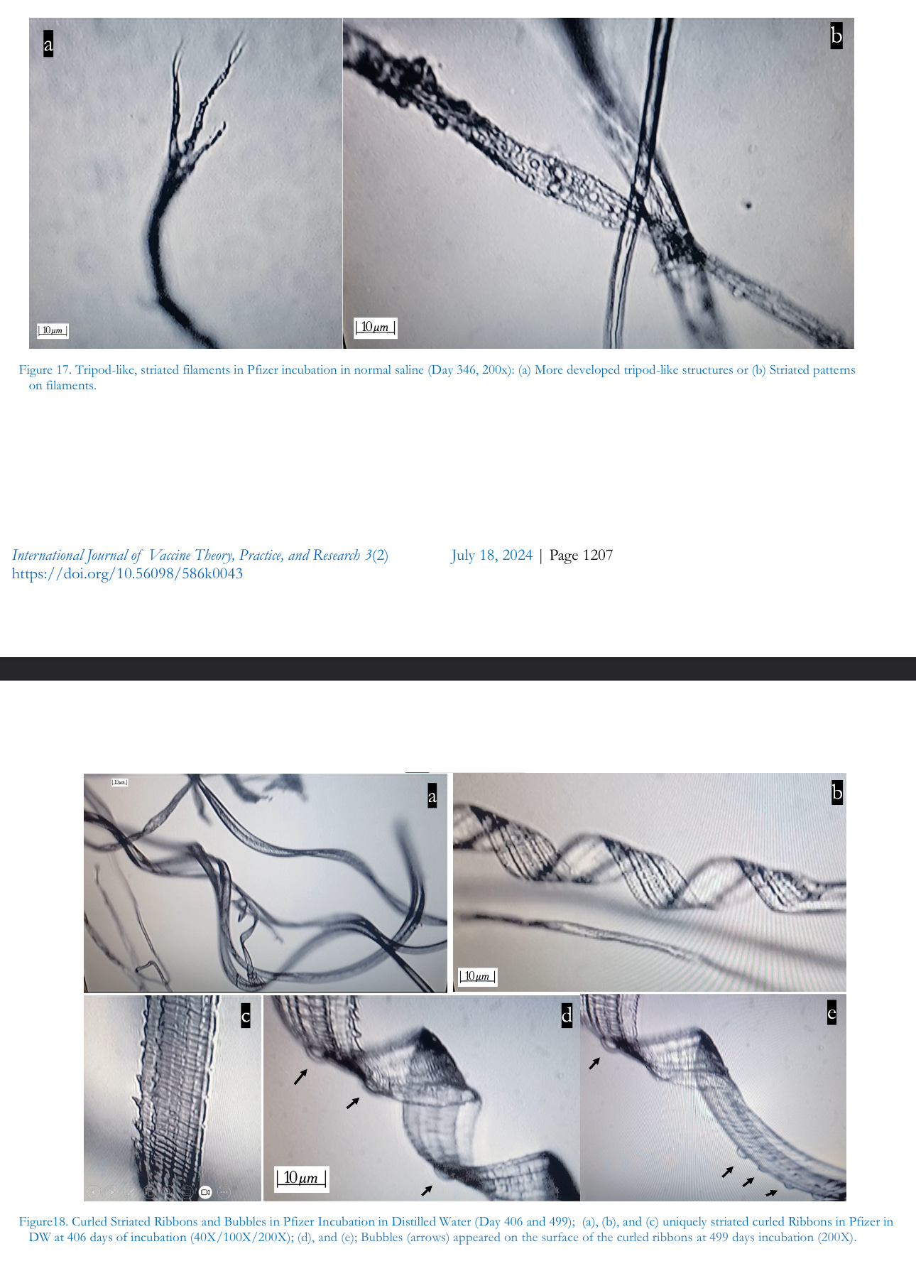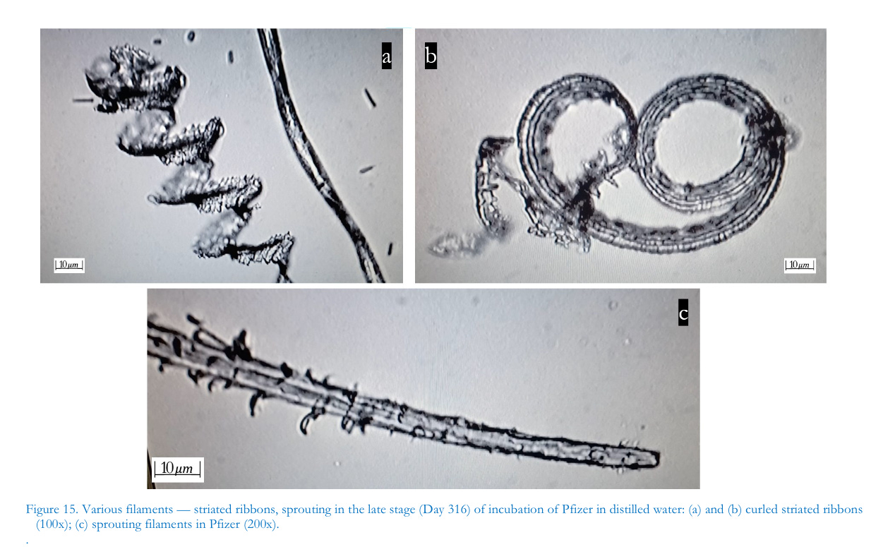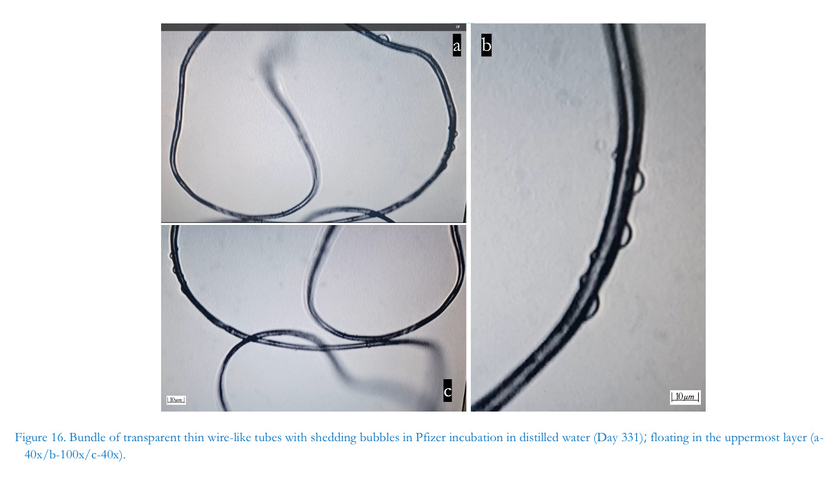 Noteworthy, also, is observed phenomena in the uppermost layer and the middle layer of the culture media likely due to the mass and weight of the structures. During the late stage of incubation of Pfizer in distilled waterat about day 337, transparent bundles of wire-like hollow tubes emerged and, in the uppermost layer, appeared similar in structure to skin extract 2 (another anonymized patient designated simply as E2). These filaments were different in character, however, from ordinary filaments. As of this writing, the tubes have since developed into unique striated curled ribbons. This process of dynamic and changing morphology represents a key signifier of another kind of recycling pattern likely related to injection and the production of skin extracts observable from long-term incubation studies. Furthermore, the bundles and ribbons could be more durable and long-lasting silica, or they may be synthetic graphene-coated polymer nanotubes, or similar nanowires serving as conductors or semiconductors survivable to temperatures from 1000°C to 4,000°C according to the relevant research literature (Hagimă, 2023b).