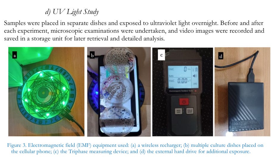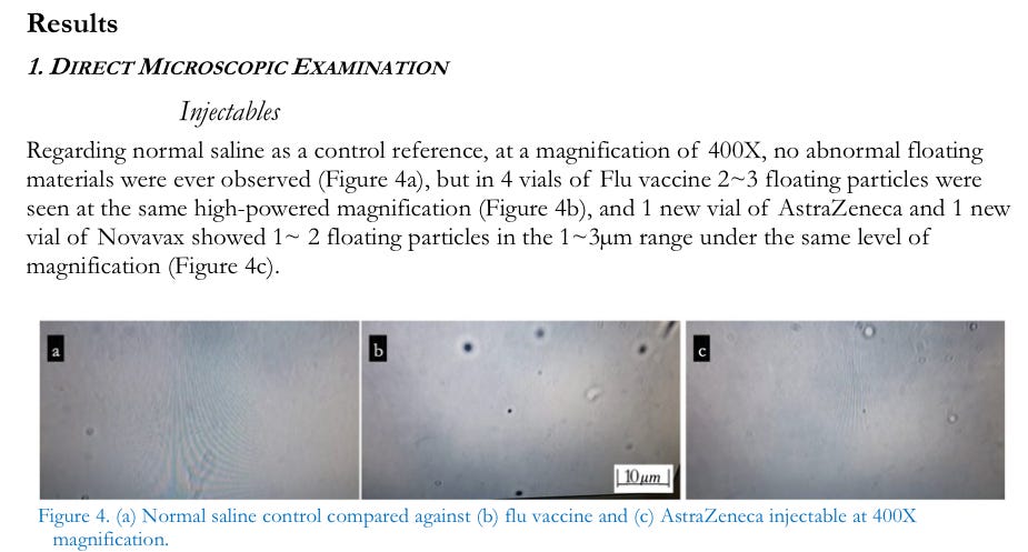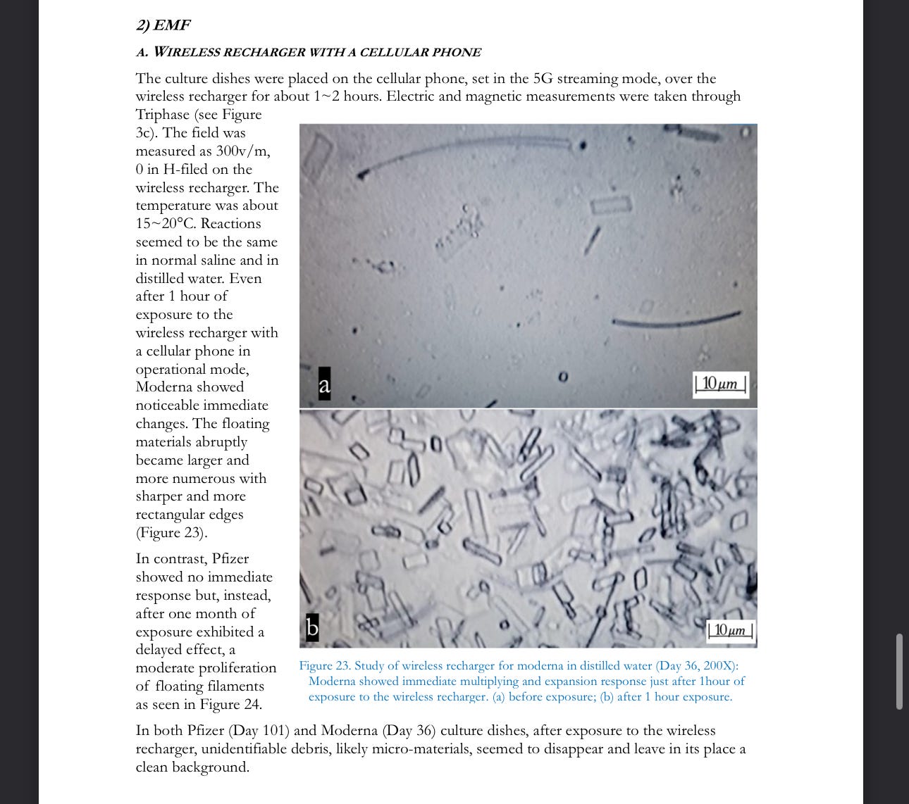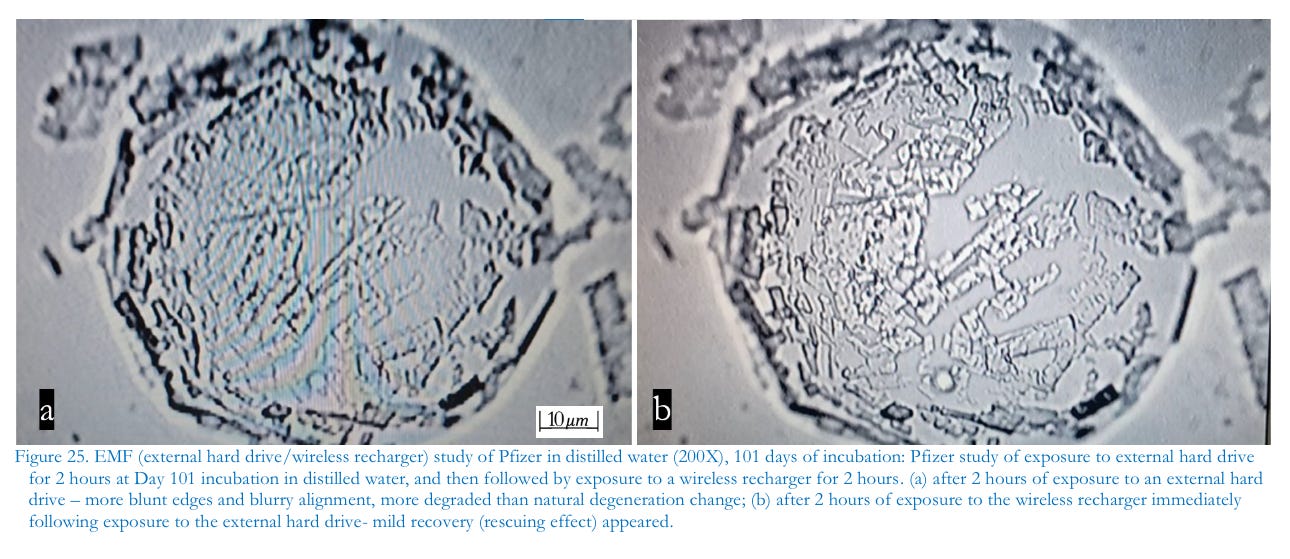 As regards “vaccine” exposure to electromagnetic energy, preliminary observations show that the materials in the injectables react positively to wireless cell phone rechargers while they react negatively to external hard drives. As electromagnetic frequency-sensitive materials, it is plausible that the injectable contents are designed to act as a kind of semi-conductor. Many researchers have called attention to the biohazardous effects of electromagnetic energy fields to the human body, especially causing carcinogenesis, neurodegeneration, damage to reproductive cells, and rapid-developing fetal cell damage (Ilori et al., 2019; Kashini et al., 2023;Noor-A-Rahim et al., 2022; Dasdag et al., 2015; Russell, 2018; Moon, 2020). Wireless rechargers or external hard drives are useful and very common personal electronic devices. If recipients of the experimental injectables (“vaccines”) have these materials circulating in their body and if they use these personal electronic devices, the devices themselves may, beyond routine electromagnetic field exposure, increase harm to their health, particularly to cellular regeneration, as the contents react synergistically with ambient radiation.