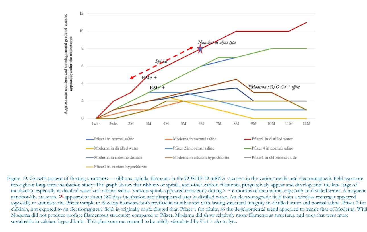 Research in nanomaterials engineering shows that Biohybrid Magnetic Robots (Microalgae-based Magnobots) could be produced and propelled throughout the body by a variety of triggering factors: electromagnetic energy,change inpH range, manipulation of glucose levels, and by varying light spectra with the aim of targeting certain tissues (Li et al., 2023). Observations during our incubation studies suggest the presence of magnobots, especially in the Pfizer sample.