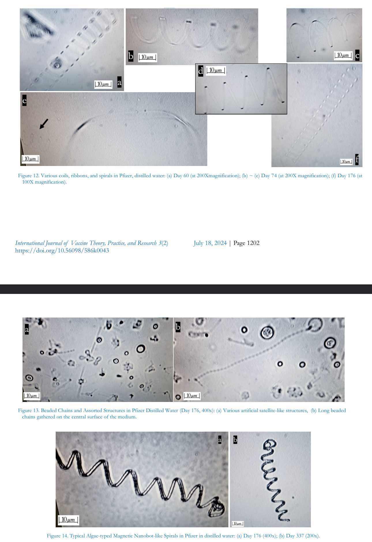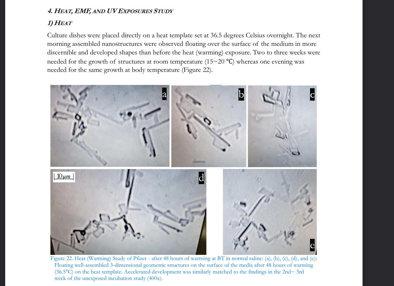 Our culture studies revealed that the Pfizer products in simple distilled water produced a variety of transparent ribbons, thin film-like membranes, coils,band spirals even without exposure to special supplements or ambient energy sources. These patterns of growth and appearance in the culture media could not be explained apart from mechanisms of action peculiar to nanotechnology (Cao, 2019; Truong et al., 2016). During the initial stage of incubation with various electrolyte solutions, the self-assembly process was possibly interrupted to some degree by the crystallization taking place in the various media and solutions and their concurrent spread across the bottom of the dish. Various kinds of transparent ribbons, films, coils,and spirals appeared in the Pfizer sample incubated in distilled water. These were very similar in structure to the micro-and magnetic-nanorobots already presented in numerous scholarly papers (Zhou et al., 2021). These structures, according to numerous researchers,could serve as signal conductors, biosensors, switches, and/or electronics devices needed for the transhumanist movement toward a post-human society (Kyrie & Broudy, 2022; Mousavi et al., 2021; Bailey, 2022; King Abdullah University, 2021; Alamoudiet al., 2021; Marsudiet al., 2021; Zhang et al., 2019; El-Husseiny et al., 2022; Shiu et al., 2022; Zhou et al, 2021; Johnson, Broudy & Hughes, 2024a, 2024b, 2024c, 2024d). These structures could also serve as nanodevices such as plasmonic antennae or as transceivers for terahertz band communications (Jornet & Akyildiz, 2014). Nanostructures are known to be stimulated to grow and carry out functions from various triggers: visible light, temperature (heat), electromagnetic fields, ultraviolet radiation, water, carbon and oxygen via air, special electrolyte-Ca++. These phenomena we have been able to confirm through longitudinal observations.