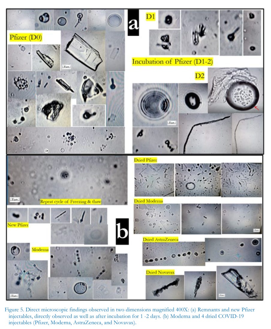 Anecdotal observations of patients suffering from a range of sudden extraordinary injuries in the wake of the initial rollout of the “vaccines” triggered our inquires both in the laboratory incubation studies and in the published literature across biology, nanotechnology, electromagnetic field science, and materials engineering. Taken from the original “vaccine” contents, the incubation studies were fruitful in helping to identify various foreign materials and to better understand their possible pathophysiology in vivo. Other researchers, however, have offered alternate opinions that the materials could simply be sodium chloride (NaCl), and other contaminants, and their observed behaviors simply the result of natural crystallization.