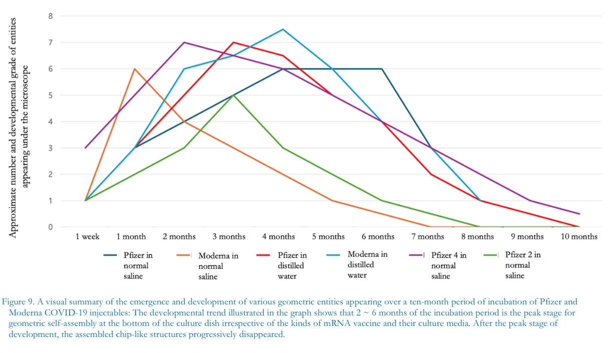 Significantly, mRNA technology is often marketed in terms of software as a kind of operating system or technology platform (per Moderna’s Website). Although Moderna’s original characterization of mRNA technology as a computer program has been deleted from their website, we offer it to readers as a reminder of their prototypical concept: Recognizing the broad potential of mRNA science, we set out to create an mRNA technology platform that functions very much like an operating system on a computer. It is designed so that it can plug and play interchangeably with different programs. In our case, the “program” or “app” is our mRNA drug —the unique mRNA sequence that codes for a protein (Moderna quoted in many articles, e.g., see Reuters, 2021; Martin, 2024). The geometric patterns of most of the self-assembled structures, as in electronic circuits or 3-dimensional chip-like structures, progressively degraded after about day 80 during incubation of the Pfizer booster (injection number 4, P4), which has a different timeline from the other injectables (P1, P2 & Moderna), while similar degradation patterns were also manifested. This means that the injected nanomaterials appear to be programmed to behave in the manner observed and to carry out regular intervals of self-assembly and disassembly.