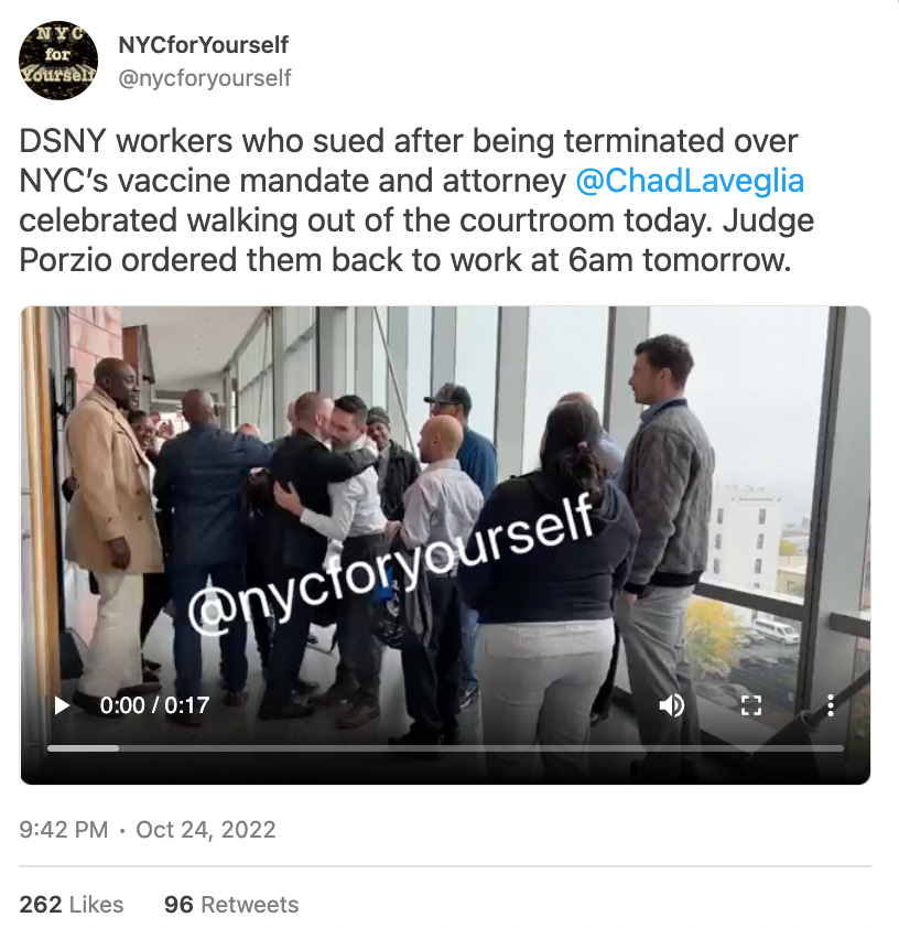 "So my name's Chad Laveglia. I'm an attorney who gets to represent these fine men and women over here. What just happened was the judge found that the city's vaccine mandate is unconstitutional. Violates separation of powers... found it to be arbitrary and capricious. He found the commissioner's order mandating private and public employees to get vaccinated was arbitrary and capricious and it's null-and-void essentially."