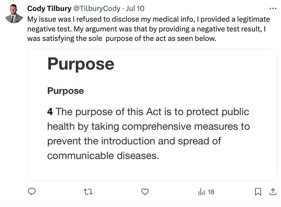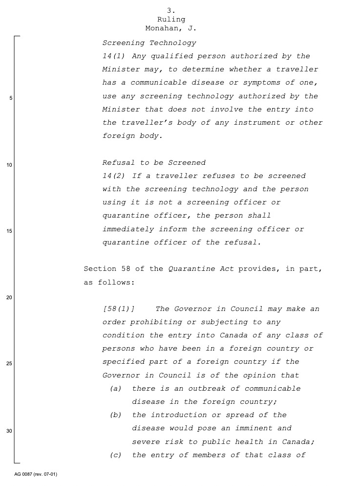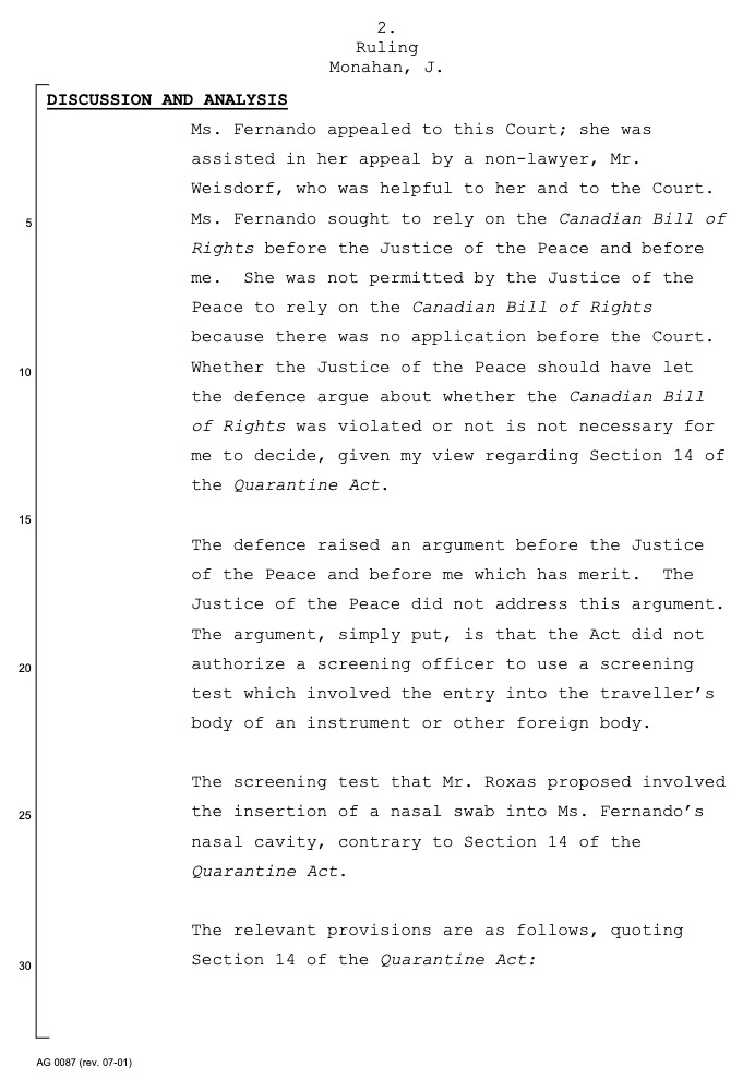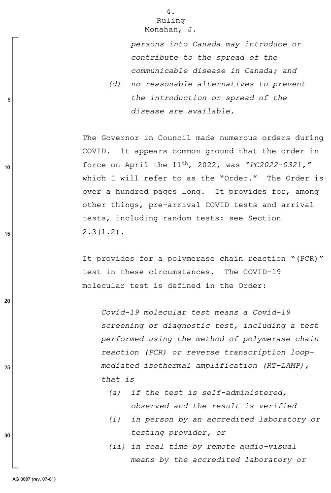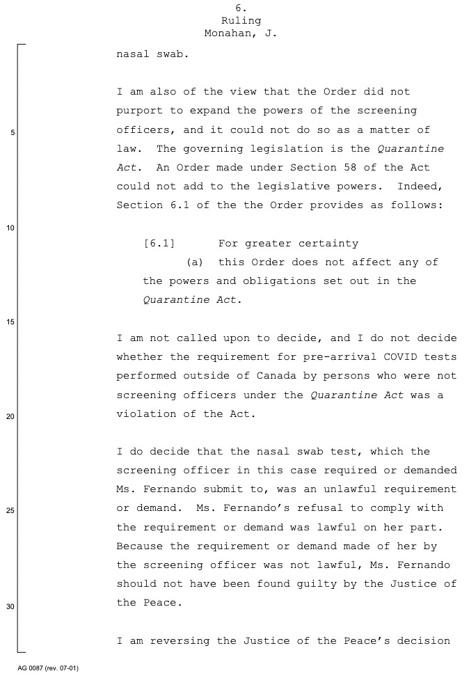 In this ruling, Justice Monahan determined that demanding a polymerase chain reaction (PCR) test for Covid was a violation of the Quarantine Act. The specific reason why it was ruled unlawful is because it is a “foreign body” or “instrument” inserted into the body.