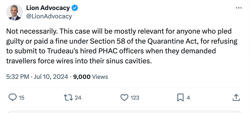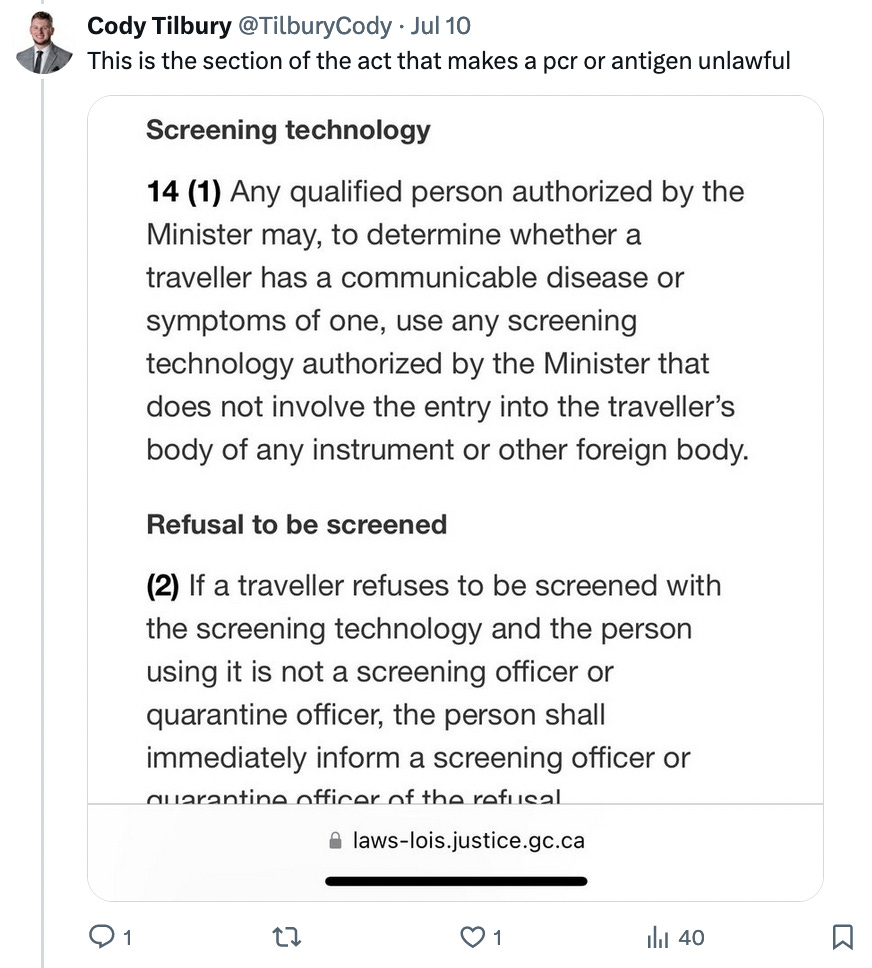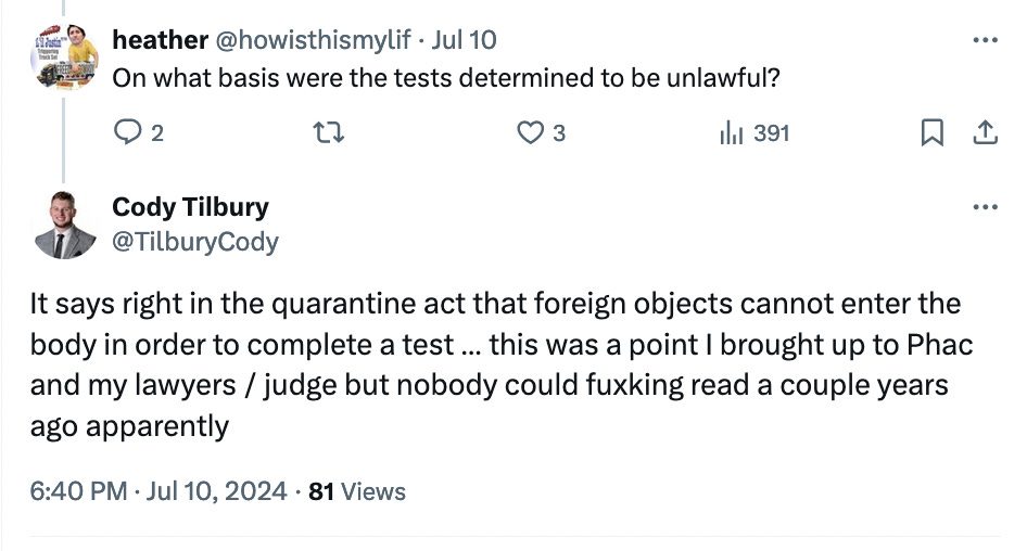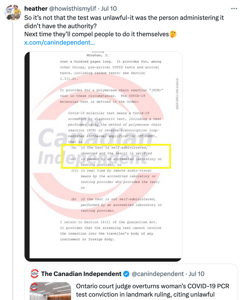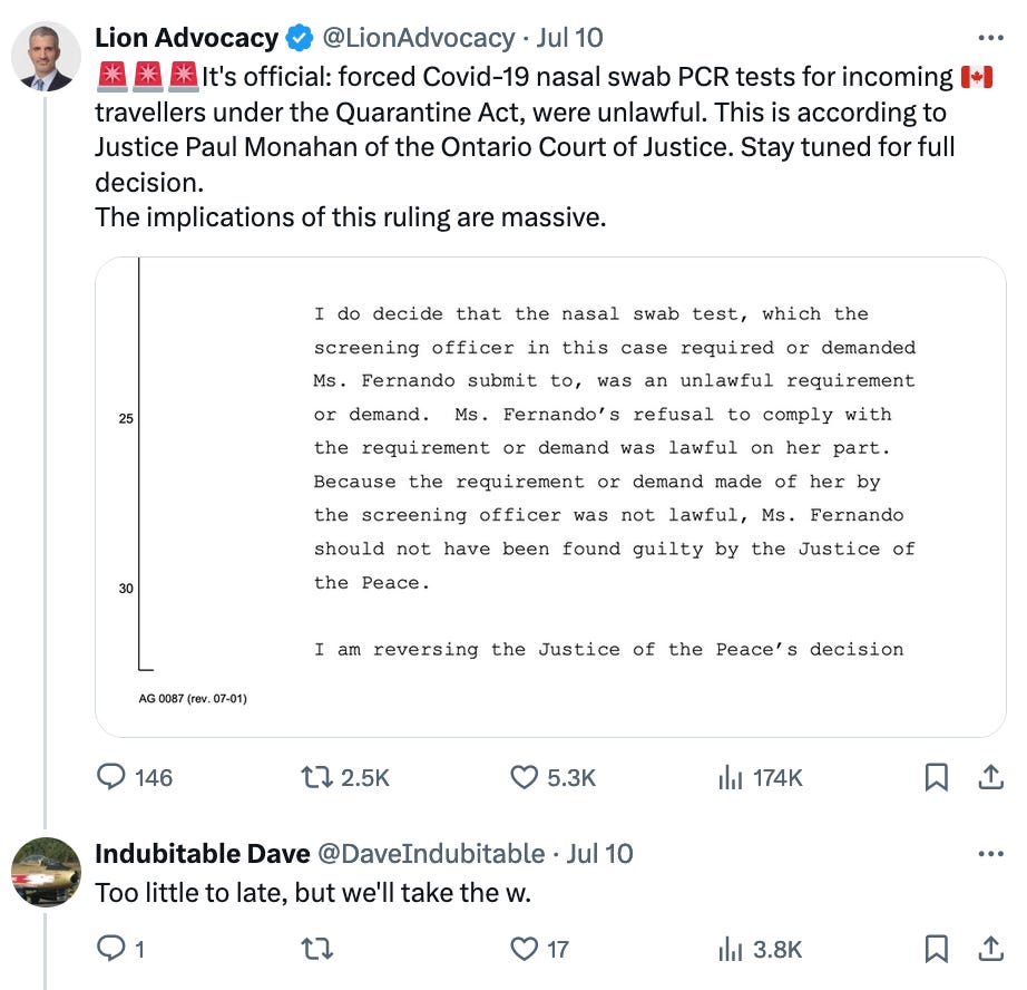 On July 10, 2024, Canada’s Ontario Court of Justice ruled that the nasal PCR test for Covid is unlawful to force upon travelers coming into the country.