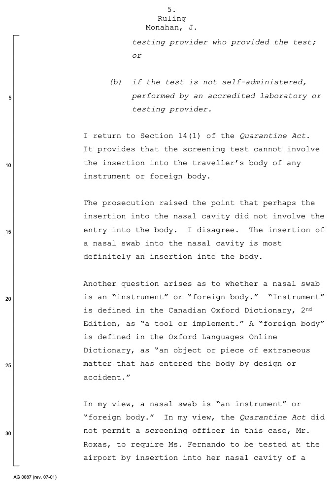 Justice Paul Monahan of the Ontario Court of Justice ruled it is Unlawful to Force Covid-19 Nasal PCR Tests for Incoming Travelers under the Quarantine Act, as it is an "Instrument" or "Foreign Body"