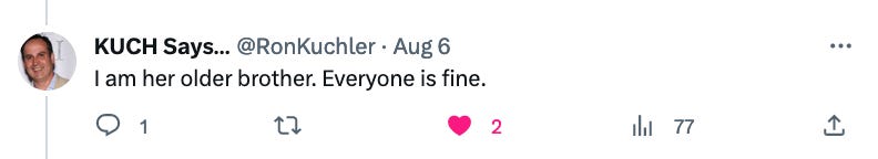 Here is public confirmation from Karen’s older brother, that her family is fine. I also spoke directly to Ron, who expresses great appreciation for your prayers for Karen.