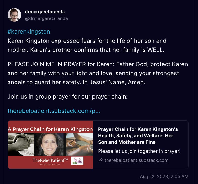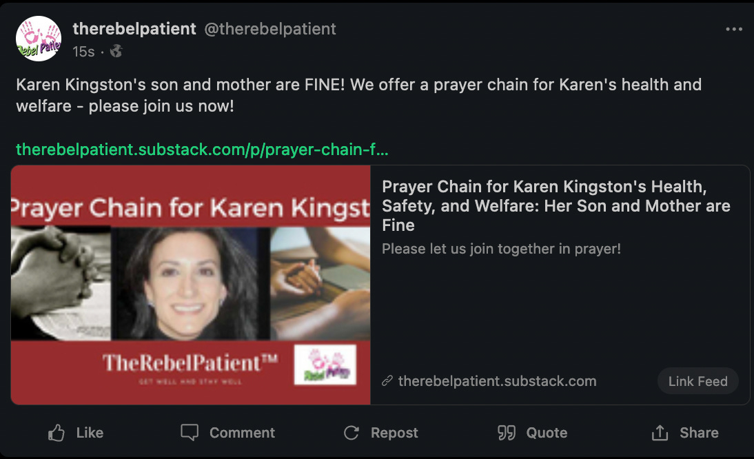 Prayer Chain for Karen Kingston's Health, Safety, and Welfare: Her Son and Mother are Fine