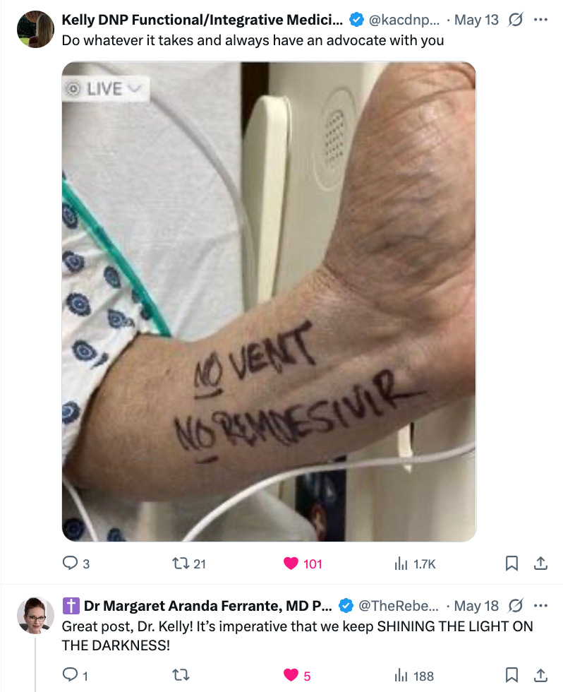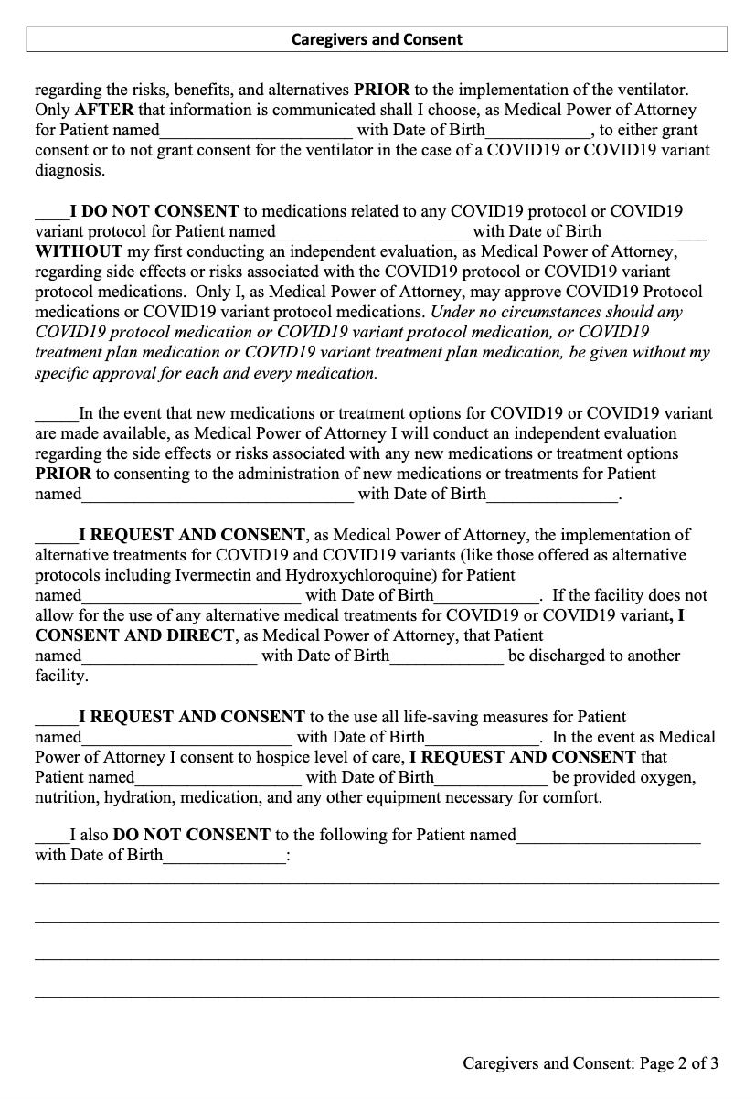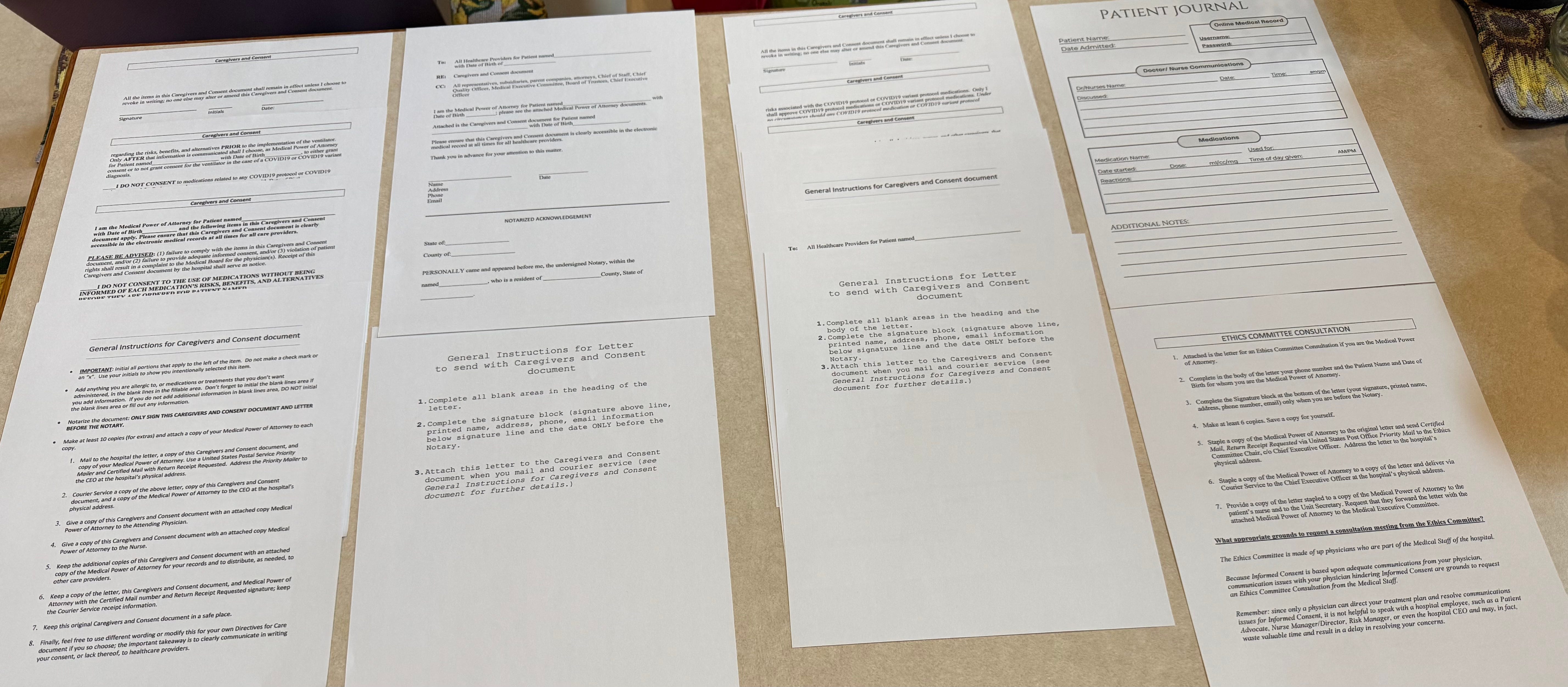Example: the Case of Rob Skiba, who never gave approval for Covid treatment (they forged his signature on the Admissions consent), including Remdesivir and a ventilator. He was texting up to the minute, saying he did not want the ventilator.