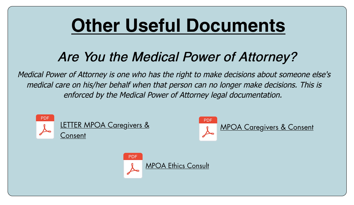1. The Medical Power of Attorney is one of 3 documents needed upon hospital admission: