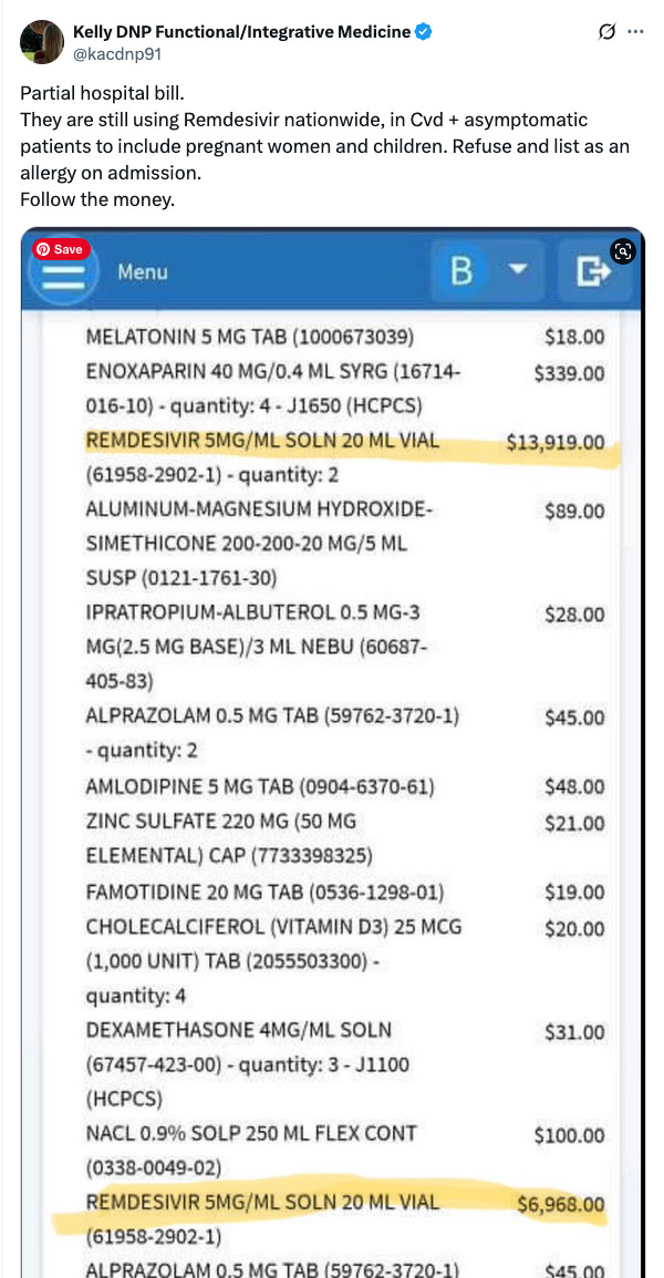 See this RECENT partial hospital bill showing they still give Remdesivir: