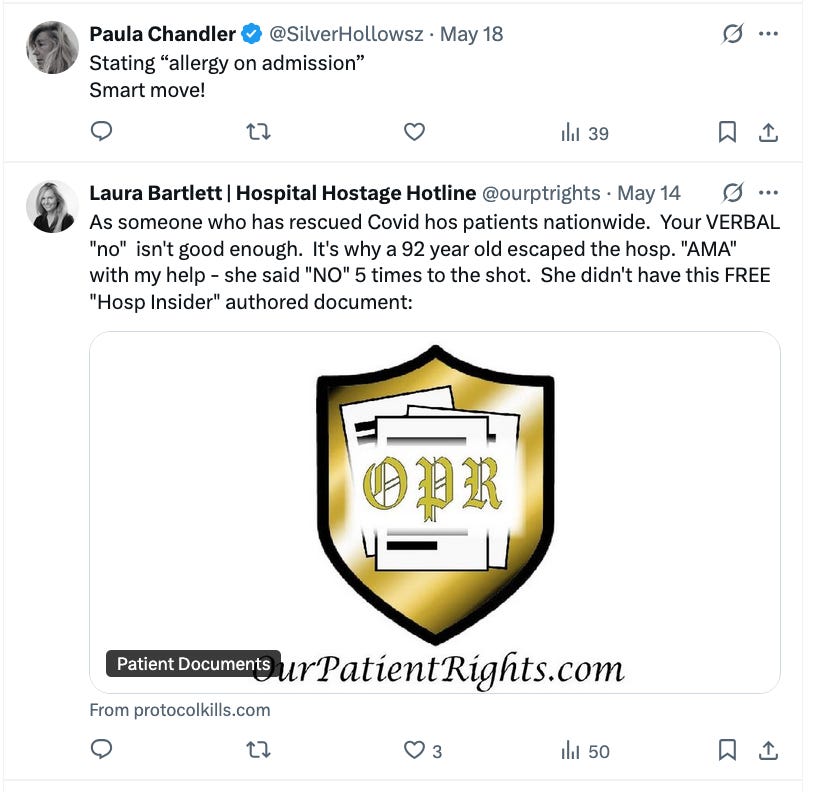 It shows you how to legally work within any hospital system to protect yourself from hospital harm. I had previously written about hospital protocols (which includes my Substack reader Poll about vaccinated vs unvaccinated blood transfusions) but recently had the opportunity to speak with Laura Bartlett and understand the legalities behind the specific services and paperwork she has made available to you FOR FREE.
