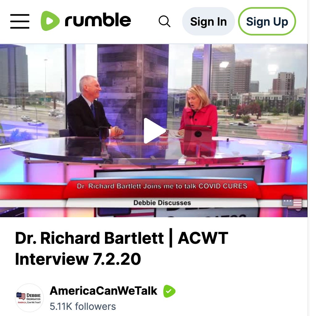 In July of 2020, Dr. Richard Bartlett was interviewed by Debbie Georgatos, the Host of “America Can We Talk”. Laura was initially able to get the video on YouTube. This video went viral with 5 million views! It was subsequently banned and pulled down by YouTube. Of course!