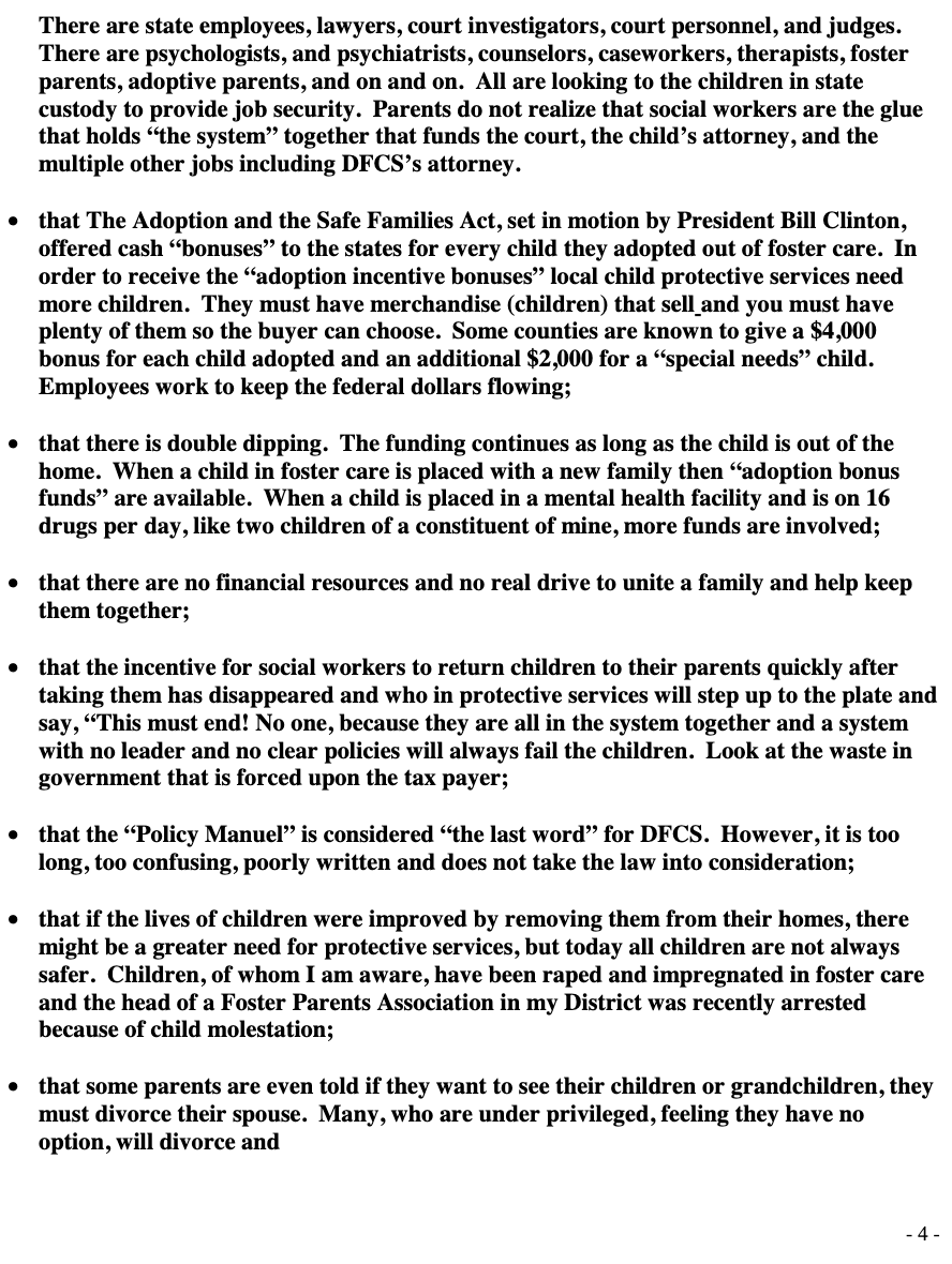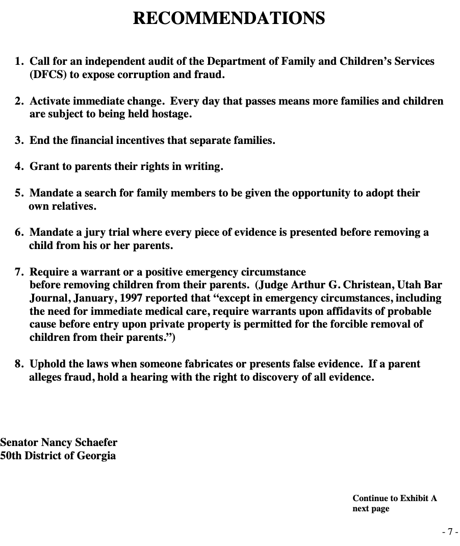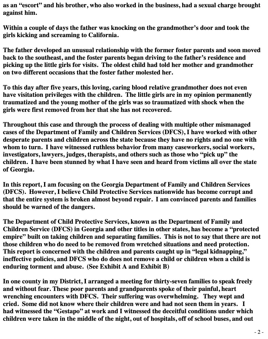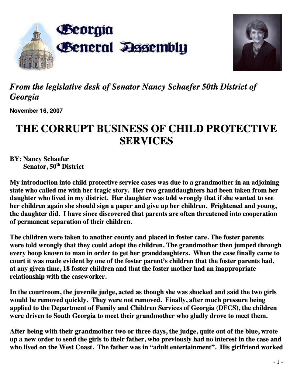 See References below for Sen. Nancy’s report, "The Corrupt Business of Child Protective Services".