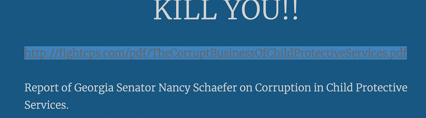 Source: https://fightcorruptedfamilycourtsandcps.wordpress.com/2011/07/13/if-you-speak-out-against-the-rape-of-your-child-by-cps-we-will-kill-you/