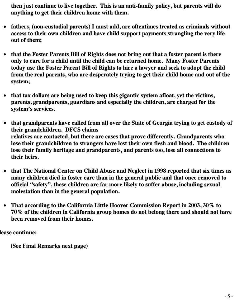 “I am convinced without a shadow of a doubt that parents across this country need to be warned of the dangers of the Child Protective Services, nationwide… the Child Protective Services has become a protected empire... built on taking children and separating families… families will have to be destroyed for the One World Government to completely develop... Children are being taken away from their parents in a ruthless kind of behavior. How do you tame Child Protective Services? It may be only by closing it completely and starting over at the beginning with pro-family values.”